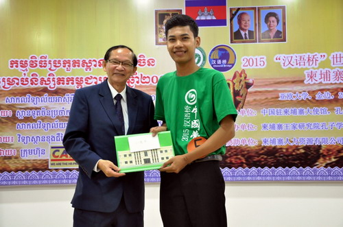 经过激烈的角逐,来自亚欧大学的江柏利用流利的汉语作的深情演讲、精彩的单口相声征服了评委获得了的冠军,他将代表柬埔寨参加于今年7月在长沙举行的“汉语桥”总决赛。 此次比赛二等奖的选手还将去中国观摩比赛,此奖项意旨在帮助更多的柬埔寨学生了解认识中国,鼓励更多的柬埔寨学生学习汉语。