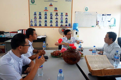 勒院长还走访了棉芷大学中文系办公室,亲切慰问了汉语教师志愿者,详细询问各位教师及志愿者教师的生活及教学情况。勒院长强调,棉芷地区是边远地区,开展工作会比较困难,更希望志愿者们克服困难,全力发挥自己的特长,积极投身于棉芷大学中文系的未来建设当中,为更好地推进汉语教学,促进中柬文化交流贡献自己的一份力量,争取取得更好的成绩。