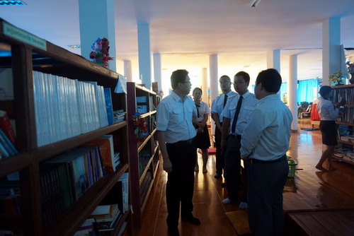 会谈结束后,谢莫尼勒院长在沙伦的陪同下参观了新装修的中文系教室及学校图书馆,勒院长指出,教学工具的现代化是教育发展的必然趋势,先进的教学工具会更好地促进中柬语言文化的交流,下一步还要购置多媒体投影仪、现代化数字电视来促进中文系的汉语教学,多举办中柬文化交流活动。