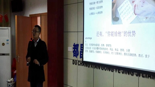 青年教师尹小勇的《营销人员优势谈判——就是让你“赢”》讲座,题材新颖,内容丰富,很有针对性的培训了企业销售人员的“优势谈判”技巧,分享了优势谈判“销售额增长10%”的谈判“秘诀”。