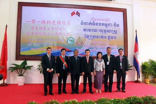 12月22日孔子学院六周年庆当天,柬埔寨王家研究院孔子学院在柬埔寨参议院会议厅举行了6周年庆典暨 “ ‘一带一路’连锁效应” 国际圆桌会议。柬中友好协会会长、柬埔寨宪法理事会主席艾森沃阁下(HE Mr. Ek Samol),九江学院副校长杨耀防教授,中国驻柬埔寨大使馆政治处程洪波主任出席会议。程洪波主任对柬埔寨王家研究院孔子学院成立6周年表示了祝贺,对孔子学院6年来的工作成果给予了极大的肯定。下午,孔子学院师生在孔子学院本部大楼举行庆孔子学院成立6周年座谈会。柬埔寨王家研究院院长、孔子学院理事长克洛媞达院士(HE KHLOT Thyda),索安(SOK An)副总理助理德沈纳院士(HE TECH Samnang),王家研究院副院长逊春文院士(HE SUM Chhum Bun)等参加了座谈会。座谈会上,大家共同观看孔子学院6周年宣传片、五湖四海祝福孔子学院视频集锦,克洛媞达院士、谢莫尼勒院长发表了重要讲话,对孔子学院未来工作作了展望。
