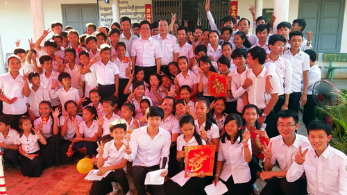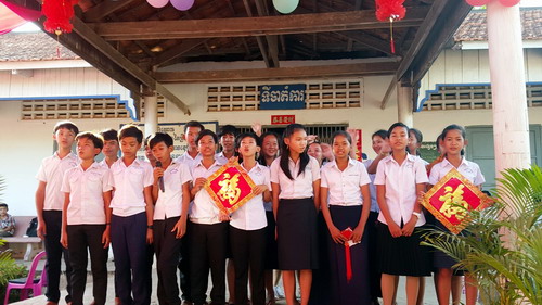 1月17日,柬埔寨王家研究院孔子学院2016年春节文化系列活动—大岛洪森中学汉语中心联欢会顺利举行。孔子学院院长谢莫尼勒阁下(HE CHEA Munyrith)、中方院长帅式毅先生,柬埔寨干拉省哥通县副县长英穆(Eng Mauk)、大岛洪森中学校长车奥克(Chhe Ouk)等嘉宾应邀出席联欢会,大岛洪森中学全体汉语教师志愿者及孔子学院学生约200人参加联欢会。