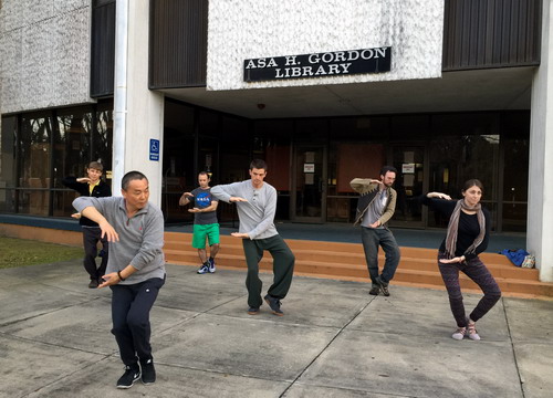 在萨凡纳州立大学图书馆楼前,梁亚强老师带领学员们一起练习“五步拳”、“二十四式太极拳”等中国功夫。梁老师教得仔细,学员们个个都学得认真。