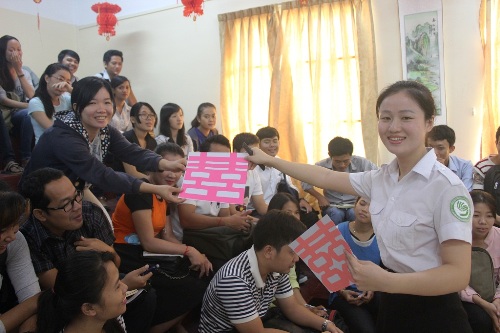 首先,许老师用剪纸剪出的不同颜色的“喜喜”字吸引了学生目光,并询问学生该字的意义和应用的场合。学生们准确地回答出了教师的提问,并解释说喜字现在在柬埔寨的婚礼中也在使用。随后,许老师用了不同的中国结婚服饰图片展示给学生,让学生了解中式婚礼。因为参加文化讲座的学生大部分为对汉语有浓厚兴趣的初级学者,所以,许老师用了很多通俗易懂的词语,并教授学生有关婚礼的实用字词,学生们学得很认真,积极努力地配合教师讲座的每一环节。
