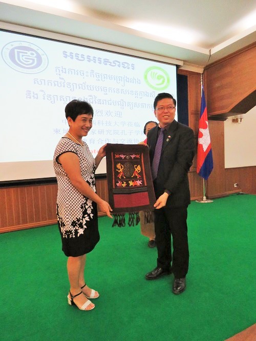 谢莫尼勒阁下向广西科技大学代表介绍了中柬双方友好合作的历史,并针对未来合作方向作出展望。覃萍女士表示,为响应国家“一带一路”政策,广西科技大学为“一带一路”沿线国家专门设立了留学生奖学金,并向孔子学院发出邀请,希望能进一步加深与孔子学院合作,进行师生互派、夏(冬)令营、合作办学等多种形式的文化和教育交流活动。谢莫尼勒阁下响应了覃萍女士的热情邀请,并希望能成为中国广西科技大学与国家汉办及九江学院的友谊桥梁,促进多方合作,共同发展。
