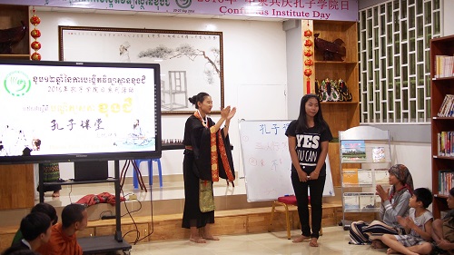 9月22日下午,柬埔寨王家研究院孔子学院孔子学院日系列活动之二——穿越时空体验“孔子课堂”的文化活动在金边孔子学院本部举行。该活动在孔子学院学生的满怀期待中如期开展。王楚燕老师扮演“孔子”,何其颖老师身穿飘逸的蓝色汉服主持本次活动,孔子学院教师及下午班100余名学生参加本次文化活动。