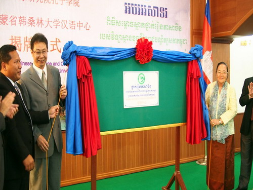 克洛媞达院士和张德意社长为特本克蒙省韩桑林大学汉语中心揭牌,该中心是柬埔寨孔子学院在柬埔寨的第9个省开办的第30个汉语教学点,韩桑林大学是由中国政府援建的新开办的公立大学,位于柬埔寨的特本克蒙省。 随着孔子学院在柬埔寨各界的影响越来越大,越来越广,孔子学院将逐步在柬埔寨各省设立汉语教学中心,以满足柬埔寨民众学习汉语的需要。