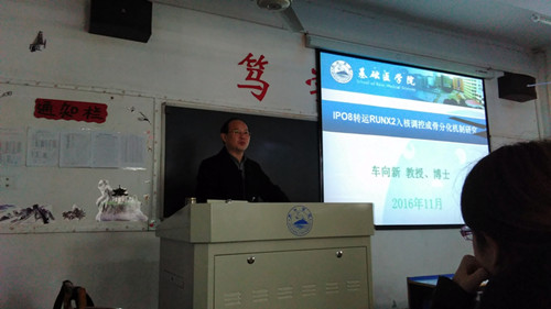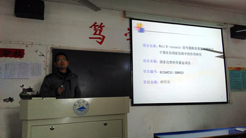 报告会上,车向新院长、王中平博士、曹俊老师分别对其获得立项的国家自然科学基金《IPO8转运RUNX2入核调控成骨分化机制研究》、《Wnt/β-catenin 信号通路表观遗传调控及干预在自闭症发病中的作用研究》、《视黄酸平衡调控hMSCs成骨及成脂分化》的研究内容、研究进展和研究成果进行报告;黄绍鑫博士做了题为《MRP1与GSH在睾丸支持细胞铅转运中的作用研究》的学术报告,对博士期间完成的科研成果进行介绍。