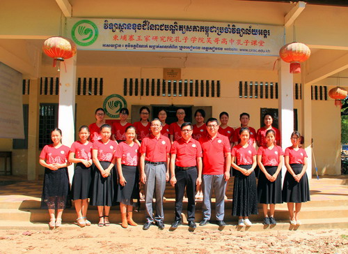 1月18日,柬埔寨王家研究院孔子学院暹粒吴哥高中孔子课堂召开了新年工作座谈会。孔子学院院长谢莫尼勒(H.E.CHEA MUNYRITH)、中方院长夏修龙及吴哥高中全体教师参加了座谈会。