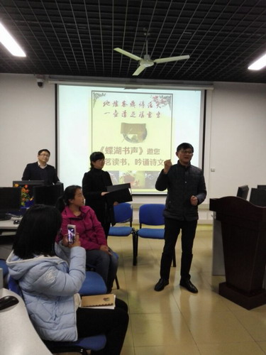 此次活动是图书馆新开通的栏目《蝶湖书声》的一次线下交流活动,旨在让读者在繁忙、紧张的学习、工作之余,用听的方式来“看书”,让眼睛暂时休息,让耳朵替我们在“书海”中继续畅游!报名此次活动的朗读者共有9人,除了爱好读书的同学和老师外,还有一位特殊的小朗读者——来自双峰小学三年级的许知薇小朋友。
