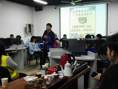 朗读会在土建学院秦华康同学带来的慷慨激昂的《九江赋》中拉开序幕,诚如他所说的:后学子弟,来自九州,缘分所致,齐聚九江宝地,江西名府,白鹿书香,一展斯地尽美!