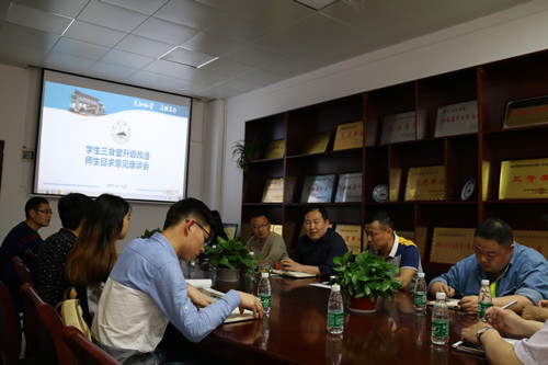如何为广大师生提供优质后勤餐饮保障服务是学校党政领导一直特别重视的问题,学校党委和行政会议决定”十三五”期间对我校就餐人数最集中的学生三食堂进行全面升级改造。为了更深入了解师生的多方需求,广泛集中师生智慧,让师生全过程民主参与食堂升级改造,4月19日下午,后勤管理处再次召开学生三食堂升级改造师生征求意见座谈会。学生处副处长郭青、二级学院教师代表、学生校长助理以及10余名学生代表,规划设计方代表、后勤管理干部近30人参加座谈会,会议由饮食服务中心主任蔡飞主持。