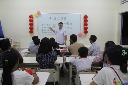 活动当晚,志愿者教师精心布置了教室,学生一进教室,浓浓的节日气息扑面而来。首先,由贾洋洋老师通过图片、PPT等形式向学生们展示并讲解了中国元宵佳节的来历和习俗。接下来是最热闹的猜灯谜活动,学生争先恐后地站到讲台上,每位学生从箱中抽取一条灯谜,大家进行了激烈的讨论,场面热闹非凡。大家都乐在其中、流连忘返。