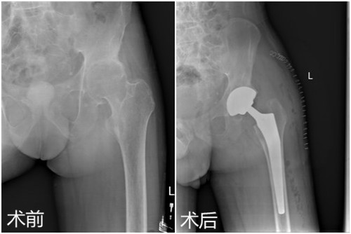 患者田先生,35岁,因身患强直性脊柱炎累及双侧髋关节,行走呈跛行步态,颈部、腰部呈僵直状,只能拄拐行走。两年前,他逐渐出现髋部疼痛不适症状,起初自行在家休息后症状稍有缓解,但两年来上述症状反复出现,并于两个月前明显加重,失去了左侧的行走能力,在当地医院就诊后效果欠佳,慕名来临床医学院/附属医院就诊。临床医学院/附属医院影像学检查显示:左髋股骨头缺血坏死继发关节退变。骨三科朱述浪主任在邀请风湿免疫科专家会诊和多次全科讨论后,决定为患者实施左侧人工全髋置换术,并制定详细的手术方案。手术过程顺利,术后切口愈合良好,术后医护人员对其进行了专业的康复锻炼,患者出院时双侧髋关节屈曲活动度超过80度。患者对临床医学院/附属医院的医疗技术及优质的护理服务予以高度赞扬。