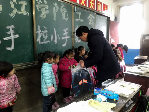 12月7日上午,伴随着绵绵冬雨,凛凛寒风,遵照校领导的指示,校工会主席金葆金和马丽君老师、王若宇老师一同前往我校扶贫点武宁县官莲乡东山村小学,为该校的25名学生送去了充满温暖的爱心书包。