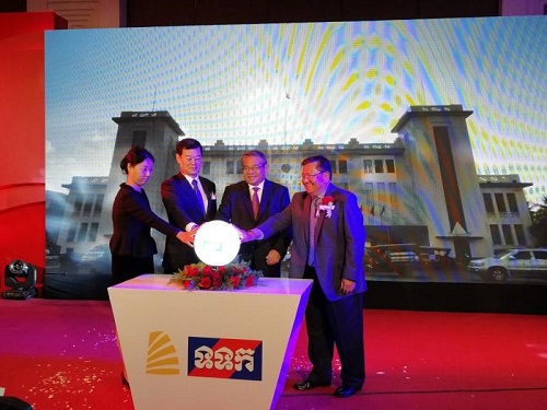 当地时间1月23日上午9:00,由国务院新闻办公室五洲传播中心和柬埔寨国家电视台倾情合力制作的纪录片《光阴的故事-中柬情谊》于金边大公爵酒店举行首播仪式。柬埔寨王国副首相尹财利阁下、中国国务院新闻办对外推广局副局长凌厉先生、中国驻柬埔寨大使馆政务参赞左文星女士、五洲传播中心副主任井水清先生、柬埔寨国家台台长金乌提先生、高棉集团董事长曹云德勋爵等领导莅临现场并发表讲话。柬埔寨皇家科学院孔子学院中方院长柴克清和柬方院长苏碧娜(Vuth Sopheakna)受邀出席首播仪式,并带领两位公派教师刘振、马剑和八位柬埔寨孔子学院亚欧大学中文系演唱学生到达现场。