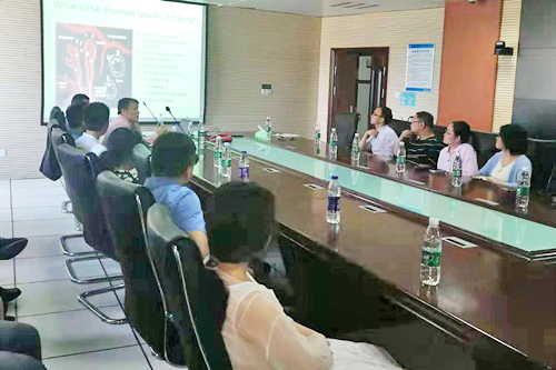 李国荣教授交流的题目为《Liquid Biopsy(exosome):Utilization in Urology》,他站在临床医生的角度,以法国居高不下的泌尿系统癌症筛查为例,强调外泌体获取容易(病人尿液中含有)、特异性强,一旦应用于泌尿系统癌症的筛查和预防,将带来不可估量的社会效益。余跃飞教授交流的题目为《外泌体液体活检在鼻咽癌早期诊断中的应用与产业化》,他以鼻咽癌为例,阐述了外泌体活检在肿瘤基因诊断中的重要性,以及未来发展的前景。讲座现场气氛活跃,在自由提问和讨论环节中,参会人员就热点问题展开提问,两位专家结合自身的科研经历逐一解答。
