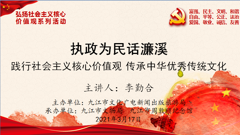 3月17日,我校庐山文化研究中心李勤合教授受邀在周敦颐纪念馆作社会主义核心价值观教育讲座。