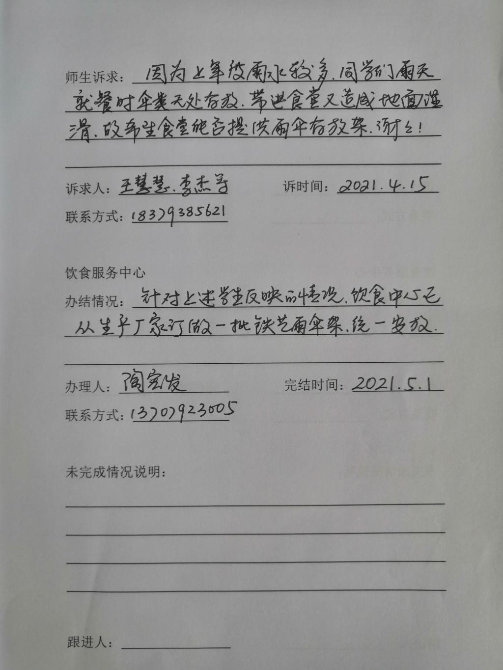 4月15日,浔东校区学生和管委会的老师在饮食服务中心“我为师生办实事”整改台账的意见册上留言,在食堂就餐雨伞无处存放,带进食堂造成地面湿滑。饮服中心很快针对师生意见统一订做了雨伞架,方便了师生就餐。这样的情况只是饮服中心“学党史为师生办实事”的一个缩影。中心各食堂大厅均放置了整改台账,并要求管理员及时按照师生要求立行立改并长期坚持。