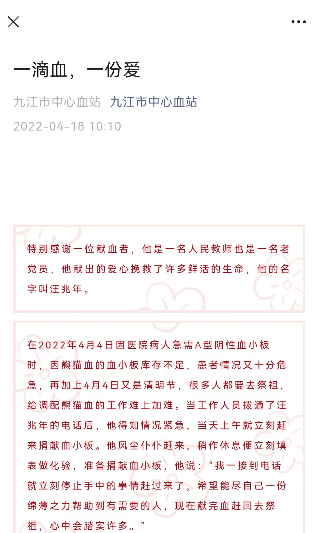 “特别感谢一位献血者,他是一名人民教师,也是一名老党员,他献出的爱心挽救了许多鲜活的生命,他的名字叫汪兆年。”4月18日,九江市中心血站的微信公众号上一篇感谢文章——《一滴血一份爱》引起了浔东管理办同事们的关注,文章中感谢的熊猫血献血者,正是大家熟悉的同事汪兆年。据了解,这已经是汪兆年第三次为患者献血了。