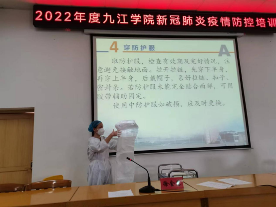 培训会上,大家一起观看了《九江学院疫情防控应急演练》视频;校医院预防科王秋慧解读了《高校新冠肺炎疫情防控技术方案(第五版)》及目前疫情防控的形势;医务部陈强盛讲解《新型冠状病毒标本采集方法与管理》;护理部李浔就《学校新冠肺炎疫情防控知识--校园消毒》;护理部徐金慧讲解并演示防护服的穿脱及操作流程,重点向大家从个人防护、科学消毒、综合防控、开学要点、风险摸排等方面对新冠肺炎疫情的形势与防控要求进行了详细讲解。