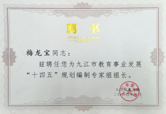 自2020年11月九江市教育局正式委托我校编制《规划》以来,梅龙宝教授带领团队成员黄为俊、伍亚魁、章新成、张亚珍、蒋枫霆、张立龙、朱青、张富生、冉丛林等,在市教育局直接领导下,经过实地调研、问卷调查、网上征集、座谈交流和专家评审,历时一年半,编制形成《规划》,经九江市人民政府第三次常务会议审议通过,于2022年4月21日正式发布,标志着梅龙宝教授团队圆满高质量完成了《规划》编制任务,为我校深化校地合作,发挥高端智库作用,服务地方经济社会发展,贡献了九江学院力量。