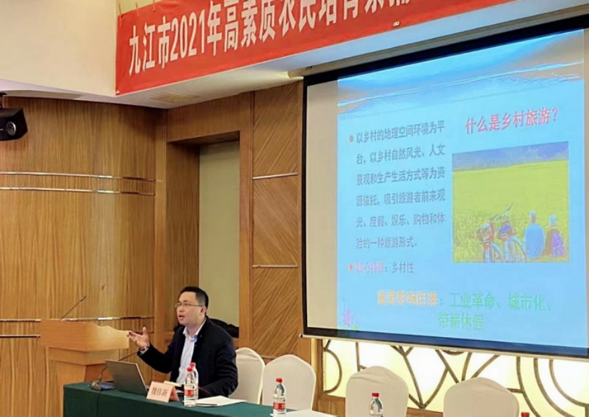 聚焦农民素质提升,精准开展专题业务技术培训。学院围绕“全面落实长江禁捕退捕任务,落实渔民转产就业”,积极联合九江市农业农村局水科所举办了“九江市2021年禁捕退捕转产农民培训班”。学院组织专业教师应邀为培训班开展“挖掘渔村文化,发展特色旅游”系列培训,围绕休闲渔业、乡村民宿、研学旅行、美丽乡村建设、乡村餐饮等内容为参训学员进行专题培训。同时,为提升都昌县干部队伍的专业素养,学院王丽霞老师以《塑造您的职业形象——职场(商务)礼仪》为专题,从职业素养切入,结合商务活动要求、党政工作实际,将商务礼仪融入到具体案例中,通过图片展示、个人示范、观众互动的形式,生动演绎了一堂既具有针对性、又具有实用性的商务礼仪课程。
