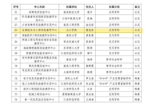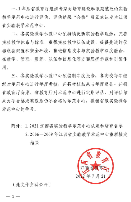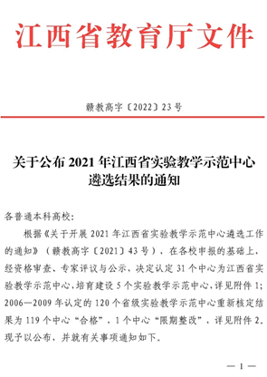 近日,根据江西省教育厅《关于公布2021年江西省实验教学示范中心遴选结果的通知》(赣教高字【2022】23号)文件通知,我校生物技术与工程实验教学中心获评江西省实验教学示范中心。此外,我校在2006—2009年获批的5个省级实验教学示范中心也顺利通过省教育厅重新核定,至此,我校共有6个江西省实验教学示范中心。