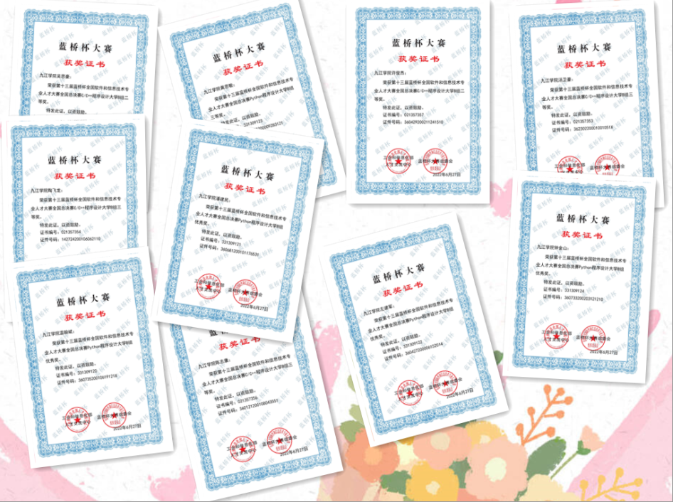 在2022年度的“第十三届蓝桥杯全国软件和信息技术专业人才大赛全国总决赛”中,通过省级竞赛选拔出的10名计算机学院学生代表九江学院参赛。参赛选手在全国总决赛中表现优异,共获得国家级奖项10个,其中,二等奖2项(许俊杰同学、吴思豪同学)、三等奖4项(陈志康、汤卫豪、黄思敏、陶飞龙)、优秀奖4项(温翰斌同学、潘建民同学、左建军同学、钟金山同学)。在此次大赛中,10名指导教师获得优秀指导教师奖,同时,九江学院获得“优秀组织单位”称号。