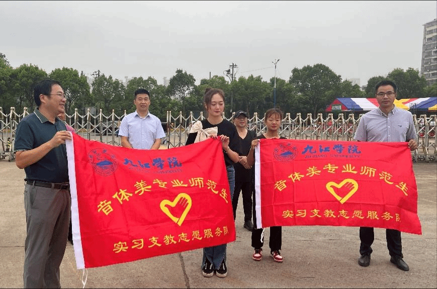 学生代表领取“九江学院音体美专业师范生实习支教服务队”旗帜