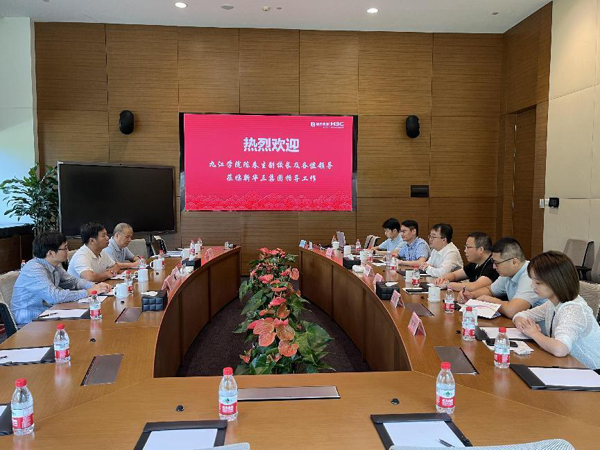 我校电子信息工程学院、计算机与大数据科学学院负责人围绕与新华三集团的产学研合作具体事项作了深入探讨。吴炜总经理详细介绍了公司“芯-云-网-边-端”全产业链在赋能百行百业数字化转型、助力校园智变、校企合作、数字化大学专业建设、协同创新平台等方面取得的成就。他表示,公司非常重视与九江学院开展深度产学研合作,将专题研究合作事宜,早日将校企合作落到实处。