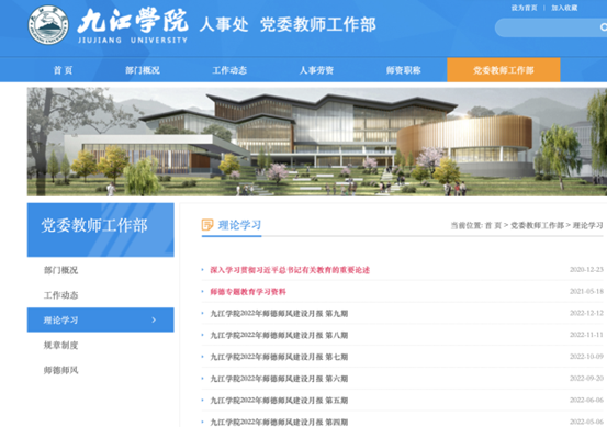 师德师风建设是高校一项持续性、长期性和系统性的工作。2022年,九江学院以学习贯彻党的二十大精神为主线,以贯彻落实《关于完善高校教师思想政治和师德师风建设工作体制机制的指导意见》为抓手,完善教师思想政治和师德师风制度规范,强化师德考核评价和激励,综合应用多种措施强化教师师德师风长效建设,引导教师成为思想文化的传播者,党执政的坚定支持者,学生健康成长的指导者和引路人,推动教师思想政治和师德师风建设工作再上新台阶。