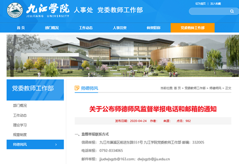 畅通师德监督渠道,建立监督举报平台。学校在校园网首页设立师德投诉举报平台,及时掌握师德信息动态,及时纠正不良倾向和问题,对师德问题做到有诉必查,有查必果,有果必复。