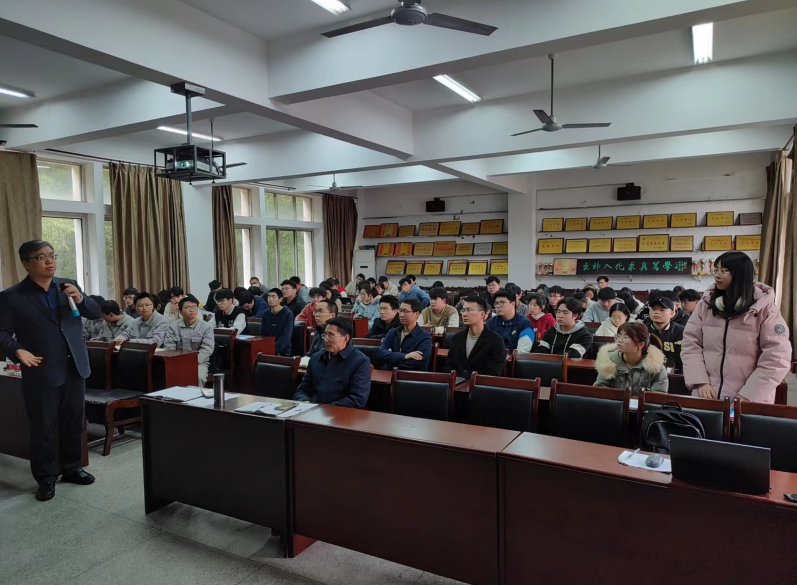 为积极服务江西省“2+6+N”重点发展产业、九江市五大“千亿”产业,加快推进化学化工类应用型人才“思科创产”四教融合培养模式改革,促进企业高管高工进校园、企业前沿技术进课堂,课程链对接产业链、产业链服务人才培养链,3月22日下午,我校化学化工学院和有机硅新材料产业学院邀请九江天赐执行董事赵经纬博士为学院师生作“锂电池新能源未来机遇与挑战”专题讲座。化学化工学院党政负责人、科研处相关负责人和学院相关专业教师,以及该学院全体大二、大三学生参加讲座。