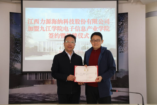 政校企三方领导共同见证了江西力源海纳科技股份有限公司与我校电子信息产业学院签订共建协议,并为新的九江市电子信息重点产业链龙头企业加盟揭牌。严平代表学校为江西力源海纳科技股份有限公司董事长黄瑞炉颁发聘书。