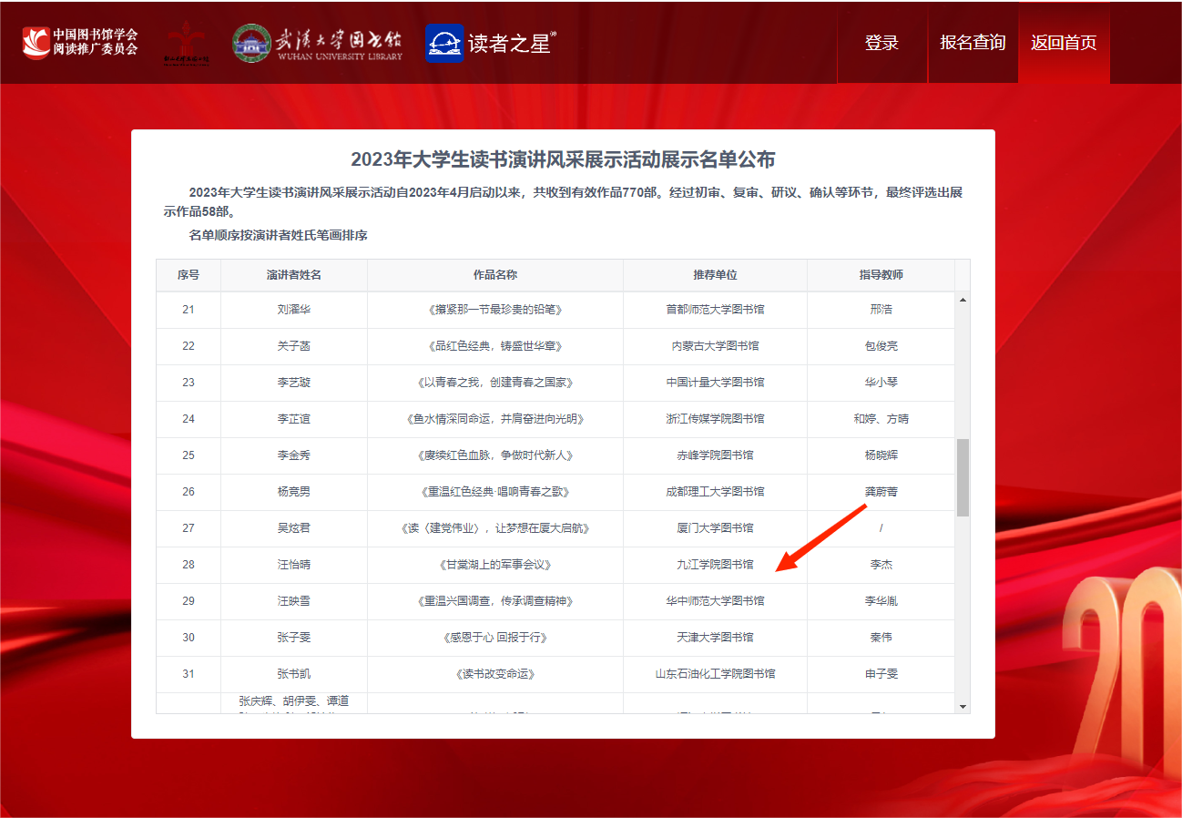 近期,中国图书馆学会公布了2023年大学生读书演讲风采展示活动评审结果。本次活动共收到全国高校推荐的作品770部,经过初审、复审、研议、确认等环节,最终评选出入展作品58部。我校学子外语A2015班汪怡晴在此次全国大学生读书演讲风采展示活动中取得佳绩,演讲作品《甘棠湖上的军事会议》(指导教师:李杰)被评为入展作品。