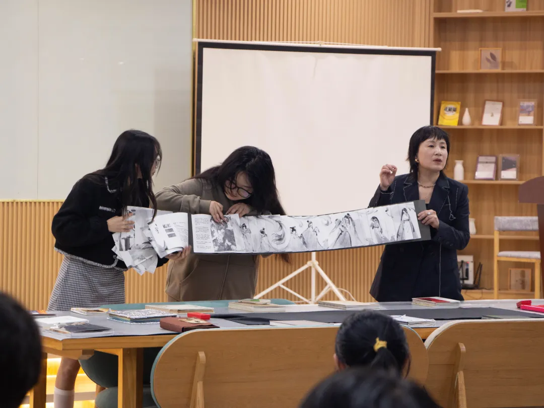 “这本《臧肆礼》采用传统龙鳞装加以现代改编,书内采用大量黑白手绘插画与古典字体,纸张使用宣纸,插图翻开后既可单独成画,在展开后也可一体成形,整体展现了现代插画与传统韵味的结合。”现场不时响起吴红艺老师的讲解。吴老师是此次活动的发起者,她对同学们的作品如数家珍。