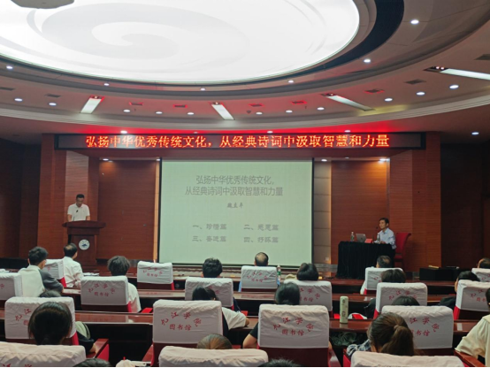 讲座中,魏立平以《弘扬中华优秀传统文化,从经典诗词中汲取智慧和力量》为题,精选珍惜、感恩、奋进等主题特色鲜明且与九江有历史渊源的著名诗人的诗词,带领师生品味经典。品读《长歌行》《劝学》《偶成》《明日歌》等诗词,激励大家珍惜时间,努力奋斗;通过《诗经·蓼莪》《游子吟》《病起书怀》等诗词,引导同学们心怀家国,感恩师长;用《行路难·其一》《竹石》《水调歌头·重上井冈山》等篇章,鼓励药生学子在面对困难和挑战时,要坚定信念和勇气,不断追求进步和成功;分享《满江红·生日感怀》《浪淘沙·从容》《新陋室铭》《水调歌头》等创作诗歌,向同学们展示了活到老学到老、不断进取的精神和对九江学院的情怀。最后,他鼓励同学们在学好专业知识的同时,也要提升综合素质,不断陶冶情操,坚定社会主义核心价值观,勇攀高峰。