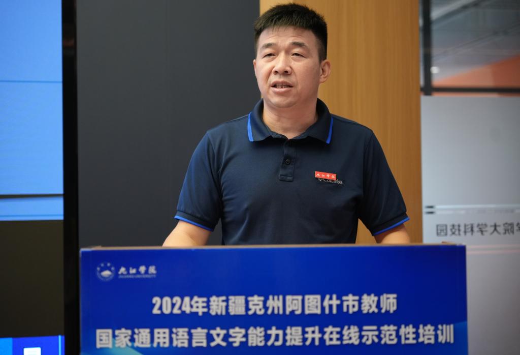 8月17日,我校举行国家语言文字推广基地对口新疆克州阿图什市教师国家通用语言文字能力提升在线示范培训班开班仪式。开班仪式以线上、线下相结合的方式同步举行。副校长、国家语言文字推广基地(九江学院)副主任李松志,阿图什市教育局党组书记、副局长马金龙出席开班仪式并讲话。