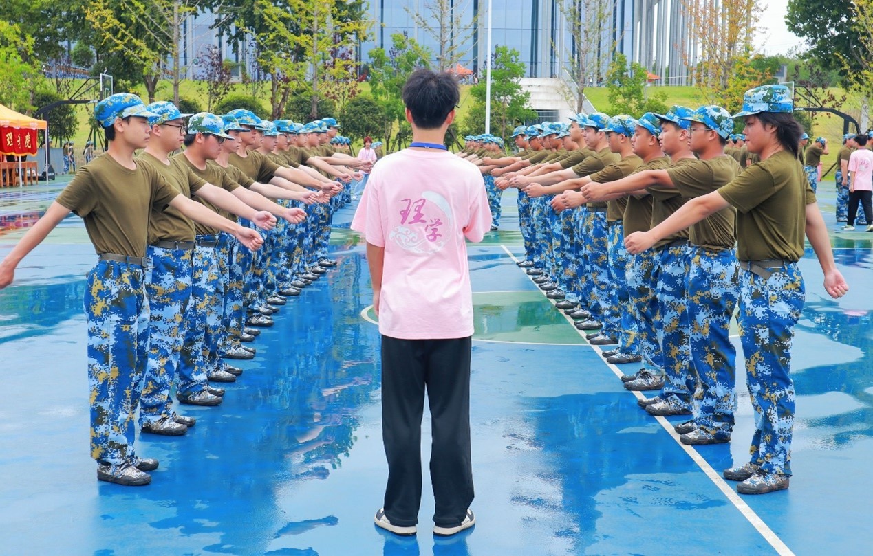 “眼要睁,口要闭,抬头挺胸,目视前方”“身体不舒服及时打报告”。除了新生,还有一群人活跃在军训场上,他们穿着统一,动作标准,带着工作牌,一丝不苟地讲解动作要领,每一次指导都精准到位,使新生们在训练中不断规范动作。