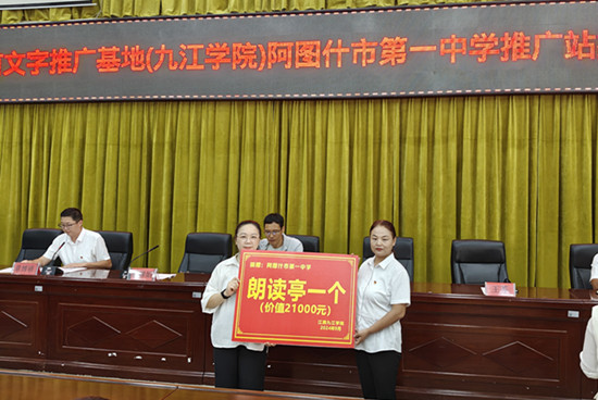 为给阿图什市第一中学师生在诵读及普通话训练等方面给予支持,在成立推广站的同时,国家语言文字推广基地(九江学院)还向该校捐赠了朗读亭一座,为师生提供一个更加便捷、高效的阅读平台,帮助师生提升阅读能力和朗诵水平。