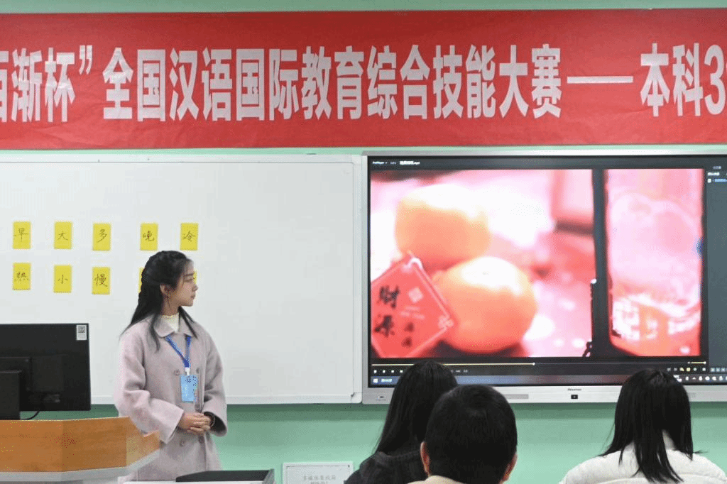 “中学西渐杯”是面向全国汉语国际教育专业大学生的高水平赛事,涵盖在线直播教学、汉语国际教育专业理论考核、教学风采展示等内容,旨在通过比赛锤炼学生的综合能力。比赛分为初赛和决赛,内容包括教学选题、教案撰写、课件制作,以及现场教学展示、中英文问答和中华文化短视频展示。无论是知识深度还是能力广度,这项赛事对选手提出了极高的挑战,更考验团队的默契与协作。