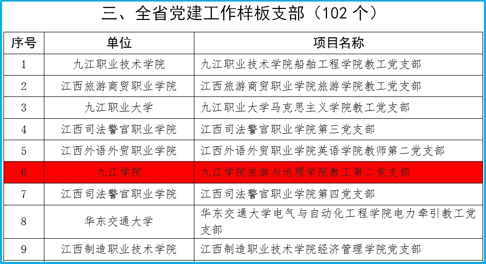 教工第二党支部2021年荣获全省教育系统“先进基层党组织”和九江市直机关工委“先进基层党组织”称号;2022年荣获九江市直单位“四强”党支部称号、九江学院“四强”党支部称号;2023年获批江西省首批“全省党建工作样板支部”;2024年获批第四批“全国党建工作样板支部”培育创建单位、全国高校“双带头人”教师党支部书记“强国行”专项行动团队、九江学院“先进基层党组织”称号。