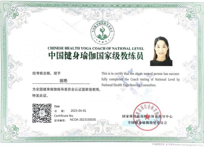 国家级健身瑜伽教练员证书