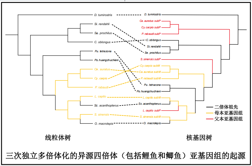 团队首先解析了三个独立多倍体化事件的异源多倍体鲤科鱼类及可能的二倍体祖先的高质量基因组图谱;然后在全基因组水平上比较核基因和线粒体基因的系统发育树,确定了亚基因组的母本和父本二倍体祖先;最后通过对多组学数据的深入挖掘,发现了多次独立多倍体化的异源四倍体鲤科鱼类亚基因组不对称进化的客观规律,揭示了母本亚基因组在多倍体鲤科鱼类适应外界环境中起重要作用。