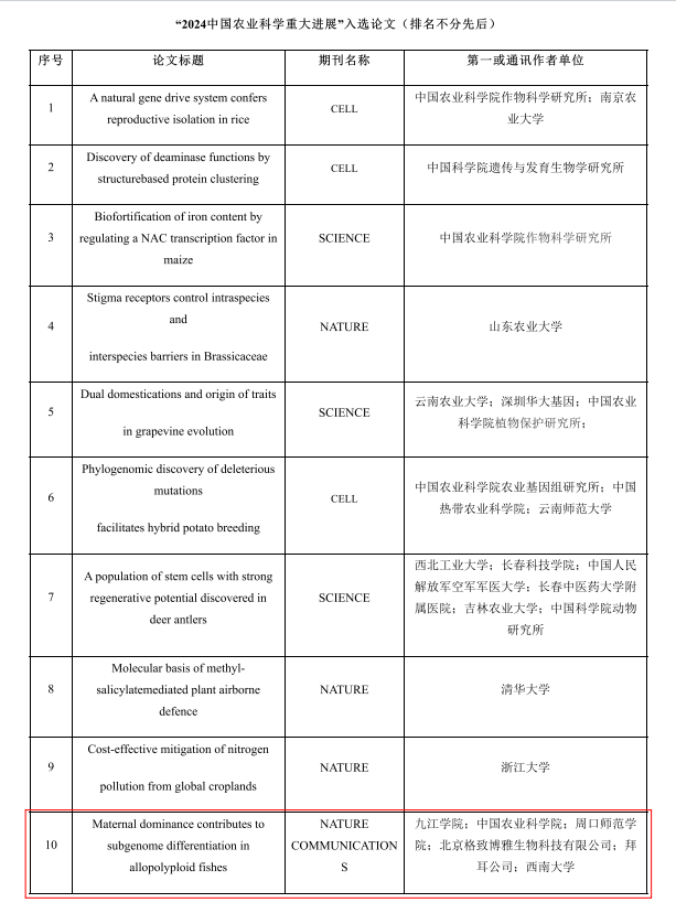 团队在Nature Communications期刊的研究成果入选10项代表2023年我国农业科技前沿、取得重大突破性进展的基础科学研究成果。2024年12月,成果以中国农业科学重大进展的形式在《2024中国农业科技发展论坛暨全球农业研究热点前沿与科技竞争力成果发布会》面向全球进行发布。此外,在2023年中国水产学会青年学术年会、江西省水产学会2023年学术年会暨江西省鲤鲫鱼遗传育种技术研讨会上作题为“母本优势有助于异源四倍体鱼类的亚基因组分化”特邀报告,在领域内产生了很高的影响力和知晓度,弘扬了我省水产行业学者在基础研究中的创新精神。(完成人:张化浩、张小谷)