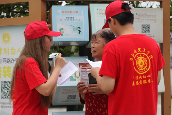 6月27日,服务队走进共青城市金湖乡和平村法治广场,服务队师生摆起了咨询桌,一同为村民提供一对一的法律咨询服务,耐心解答村民们的疑问,筑牢乡村网络法治防线。队员们围绕村民基本情况、网络安全认知等方面提前设计问卷,在活动现场以问卷调查为载体开展网络安全普法宣传,结合实际案例讲述防范要点,针对村民反映的问题借助情景模拟讲解防范技巧。
