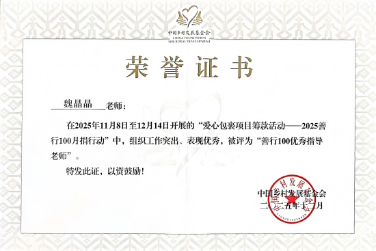 凭借扎实有效的工作成效,我校自强社被评为优秀组织单位,并收到中国乡村发展基金会正式表扬信;魏晶晶老师获评优秀指导老师,护理学院余思宇同学获评优秀组织者。下一步,学校将继续弘扬志愿服务精神,引导更多青年学子投身公益、践行担当,以持久的爱心与行动助力乡村教育发展,让公益之花在校园持续绽放。