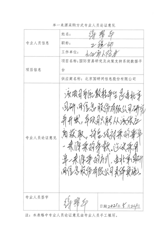 采用单一来源采购方式的原因及说明:”国际贸易研究及决策支持系统数据平台“项目是由北京国研网信息股份有限公司自主研发,符合政府采购单一来源采购情形,为此建议采用单一来源采购方式,由北京国研网信息股份有限公司具体实施。